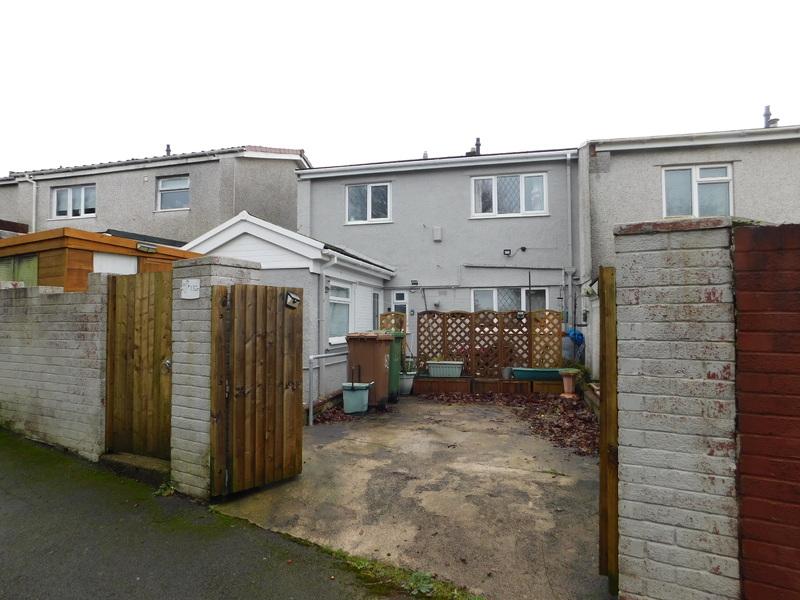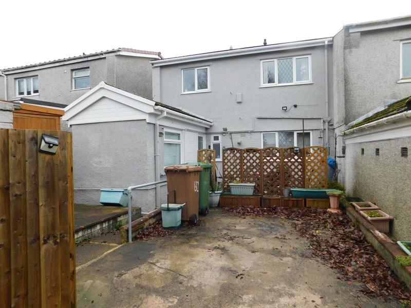 Enclosed patio area, car hard standing, wooden garden shed and wooden folding gates.