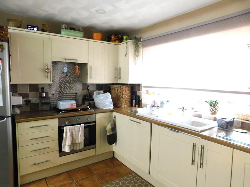 Approximate size 3.45m x 2.74m. Fitted kitchen units in a cream colour to include both freestanding and wall mounted units with a gas hob and electric oven with an extractor fan, worktops around, multiple power points, tiled splash backs, tiled flooring, and plumbed for a washing machine.