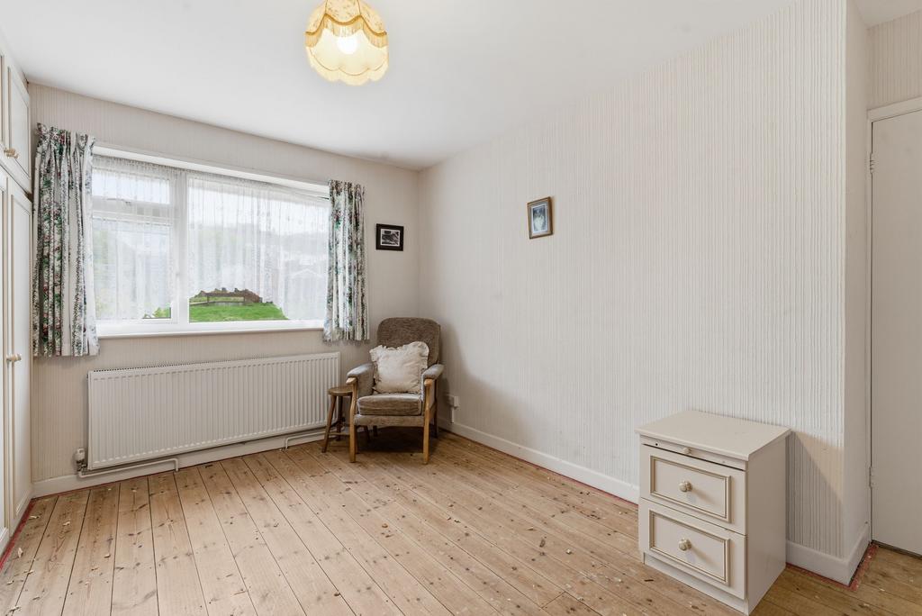 The layout includes a separate WC and a family shower room, giving future owners the option to combine the two into a larger bathroom if desired. The main bedroom overlooks the generous rear garden and includes fitted wardrobes with ample room for a double bed. The second bedroom is also well-proportioned and can accommodate a small double or work well as a study or home office.