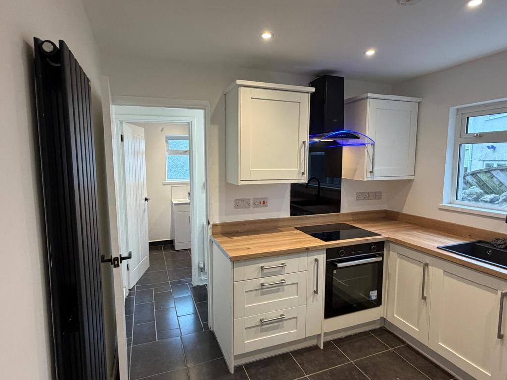 Large kitchen with built in appliances, good cupboard space and tiled flooring. Designer tall radiator and room for fridge freezer & dining table. Rear hallway leading to the garden.