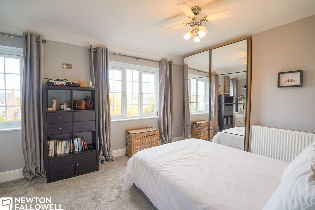 Spacious primary bedroom with two double-glazed windows to the front aspect, a double panel radiator, additional integrated storage cupboard and carpeted flooring throughout.