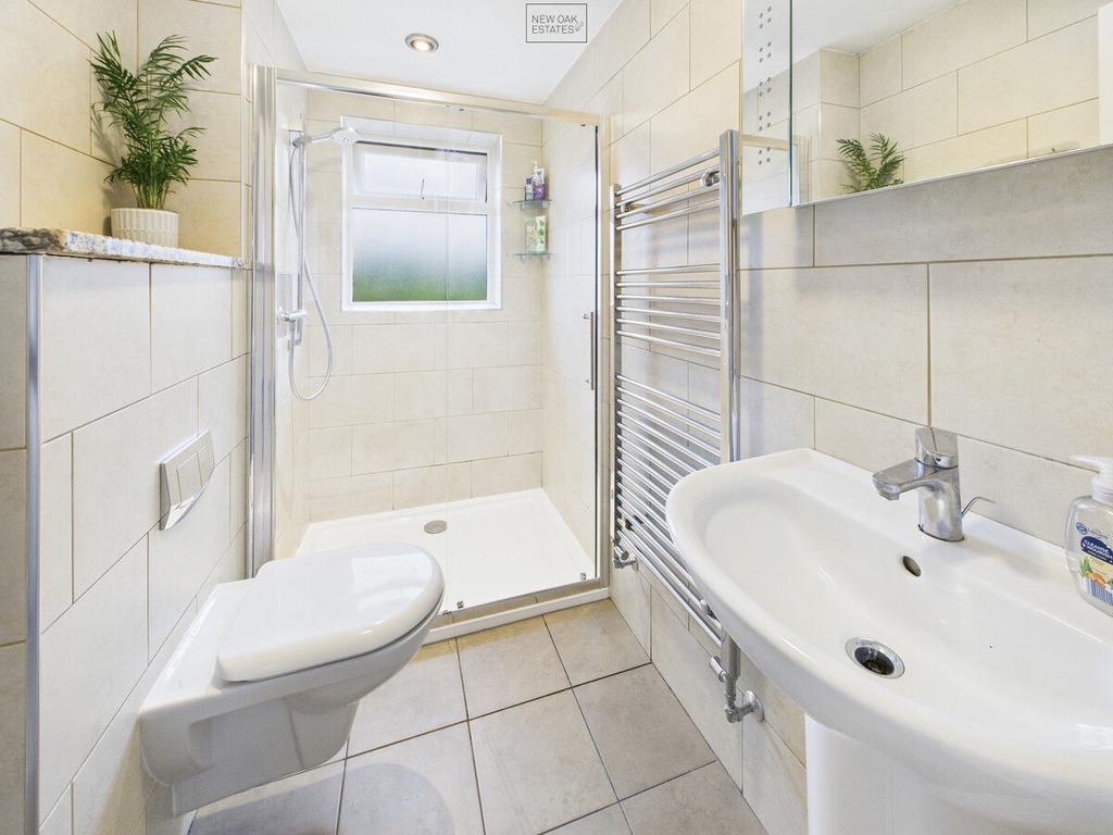 Appointed with a shower cubicle, a WC with hidden cistern and a wall hung basin with semi pedestal. There are tiled walls and floor, a heating towel rail, ceiling lights and a window to the rear.