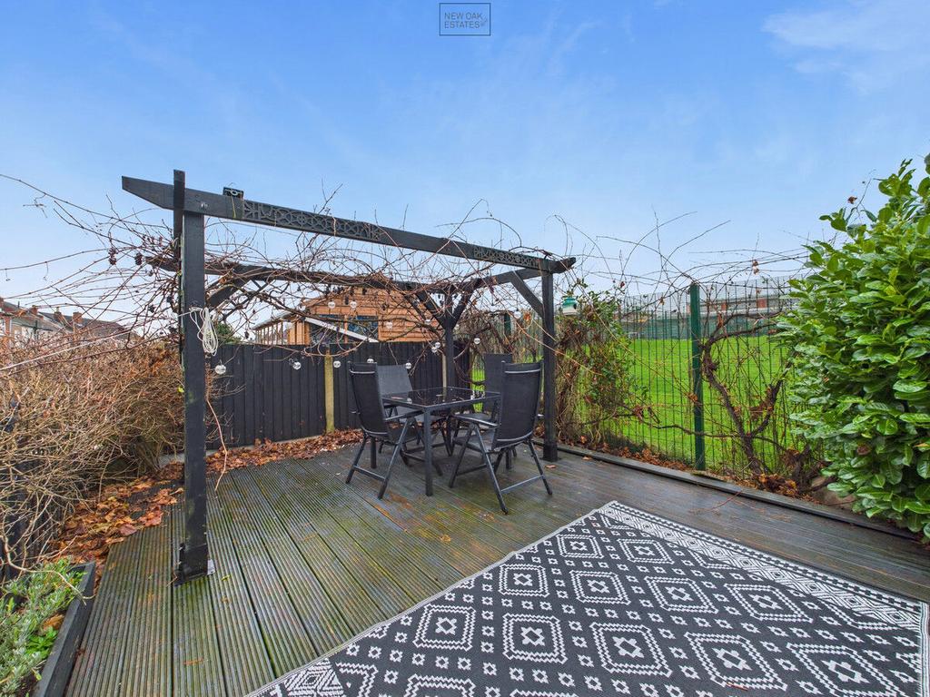 To the front of the property there is a tarmac driveway providing off road parking. The rear garden space has a large shed and patio seating area with steps rising to a decked area with pergola.
