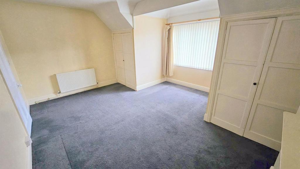 Bedroom 1 - 15'10" - A second flight of stairs leads to two well-proportioned double bedrooms. The master bedroom is notably spacious, featuring magnolia-painted walls and grey fitted carpeting. It includes built-in storage cupboards and a decorative fireplace that has been boarded up. A large double-glazed window allows plenty of natural light into the room, enhancing the sense of space.