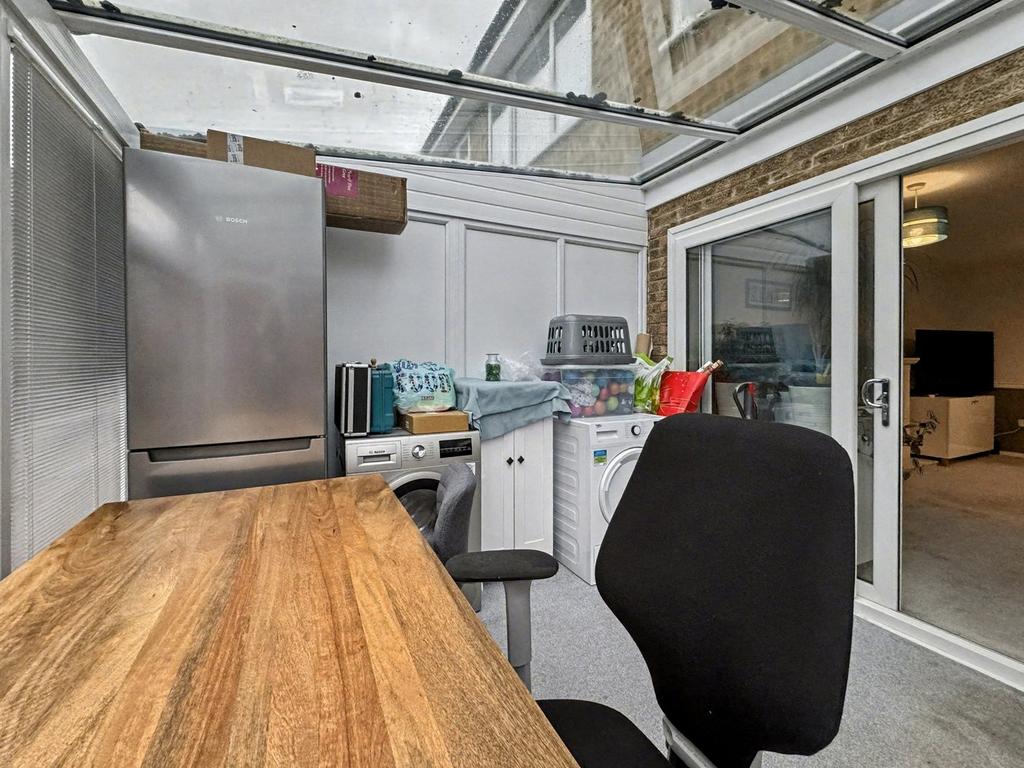A fantastic additional reception space with double French door access to the garden. Currently used as a workspace and utility area, this bright room benefits from floor-to-ceiling glass and garden views, ideal as a dining area, office, or relaxation room.