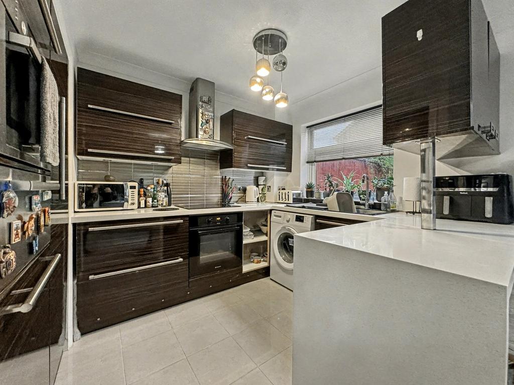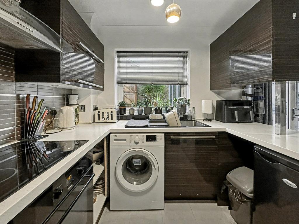 The modern fitted kitchen features sleek high-gloss cabinetry, ample worktop space, integrated microwave, oven, hob, washing machine space, and the added benefit of the fridge freezer and oven remaining.