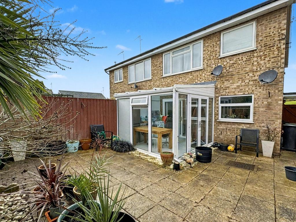 A private, low-maintenance rear garden featuring paved patio, mature potted plants, and enough room for outdoor seating or entertaining. Secure fencing and side access complete this practical outdoor space. Access to the driveway and garage.