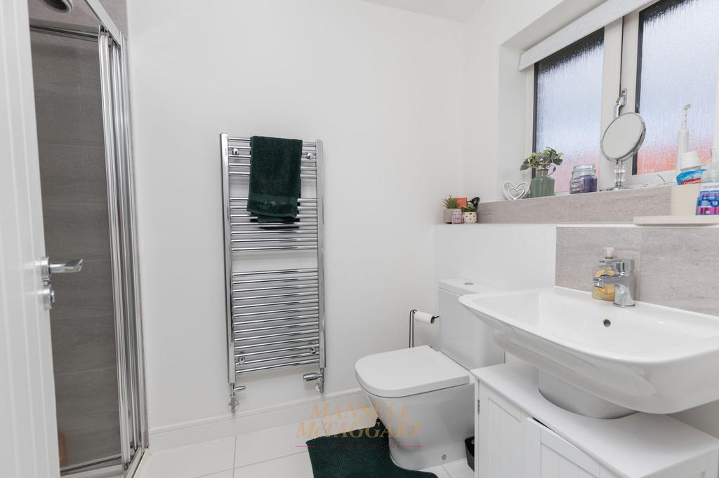 The principal bedroom suite benefits from fitted wardrobes and its own large en-suite shower room featuring a shower cubicle, low-level WC, wash hand basin, heated towel rail, extractor fan, partial tiling, and recessed spotlights.