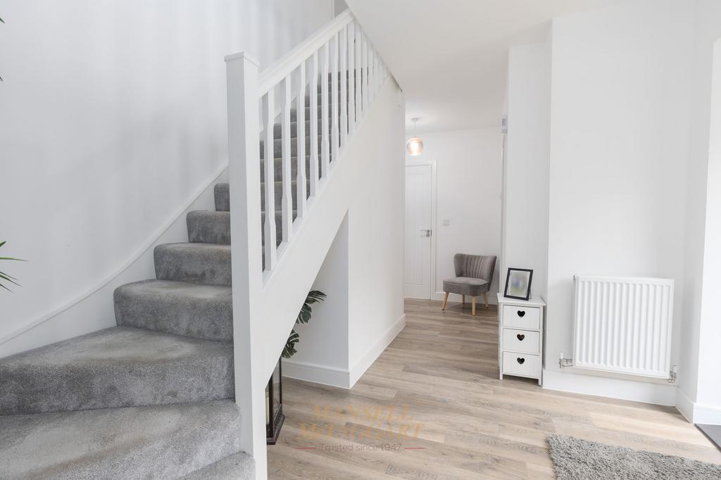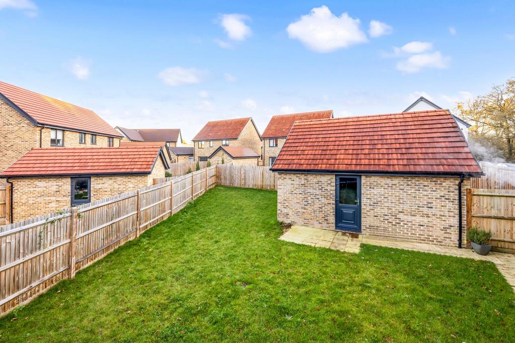 The east-facing rear garden offers an excellent balance of lawn and patio, providing areas for dining, relaxing, and children’s play. Enclosed by wooden panel fencing, it is secure and private with space for a shed or additional storage.
