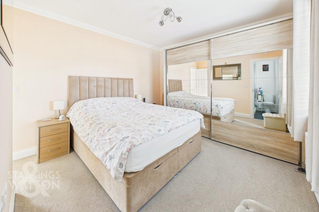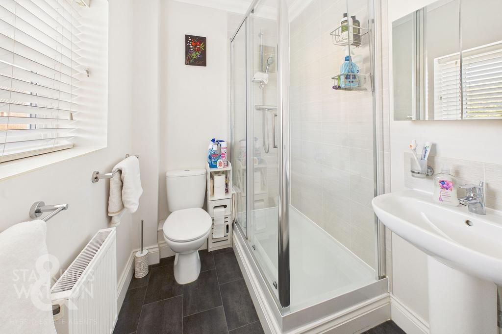 Heading upstairs, the carpeted landing includes two built-in storage cupboards. The doors lead into the three bedrooms and main family bathroom. The main double bedroom sits to the front of the property with a front facing sash window and fitted carpet underfoot, with a door taking you to a private ensuite shower room finished with a white three piece suite including a double shower cubicle with thermostatically controlled shower with tiled effect flooring, tiled splash-backs and front facing window. The two remaining bedrooms are both finished with fitted carpet and double glazing, whilst being served by the main family bathroom which is finished with a white three piece suite with half tiled walls and tiled effect flooring underfoot.