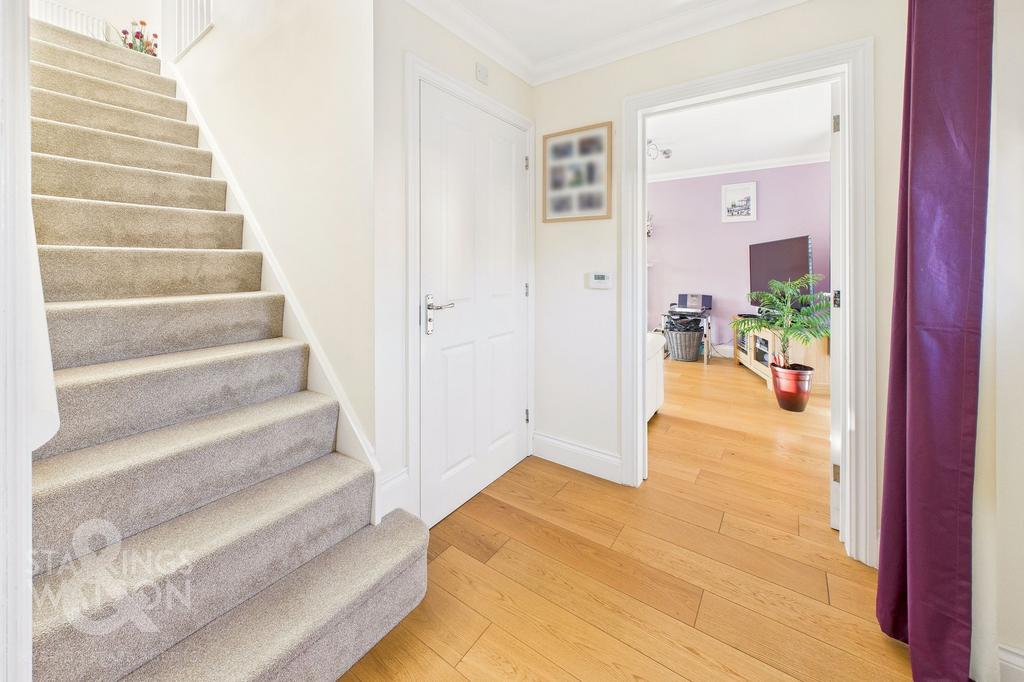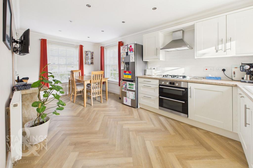 Stepping inside, the hall entrance is finished with wood flooring underfoot and stairs rising to the first floor landing. A door straight ahead leads to a useful ground floor W.C - complete with a white two piece suite with tiled effect flooring and tiled splash-backs. The main living space offers triple aspect views to front, side and rear. The front and side facing sash windows and rear facing French doors feature a fireplace with an inset cast iron wood burner, creating a focal point to the room with continued wood flooring underfoot. The kitchen/dining room also boasts a triple aspect view with front and side facing sash windows and a window facing to the rear garden. The kitchen itself offers an L-shaped arrangement of wall and base level units with integrated cooking appliances including an inset gas hob and built-in electric double oven with extractor fan above. Tiled splash-backs run around the work surface with space provided for a fridge freezer and washing machine, whilst the dishwasher is integrated. A built-in cupboard offers storage under the stairs, with wood effect herringbone style flooring underfoot and ample space for a dining table. A further door leads off to a rear entrance porch/study space - offering a versatile room with continued herringbone style flooring underfoot and a door taking you to the rear garden.