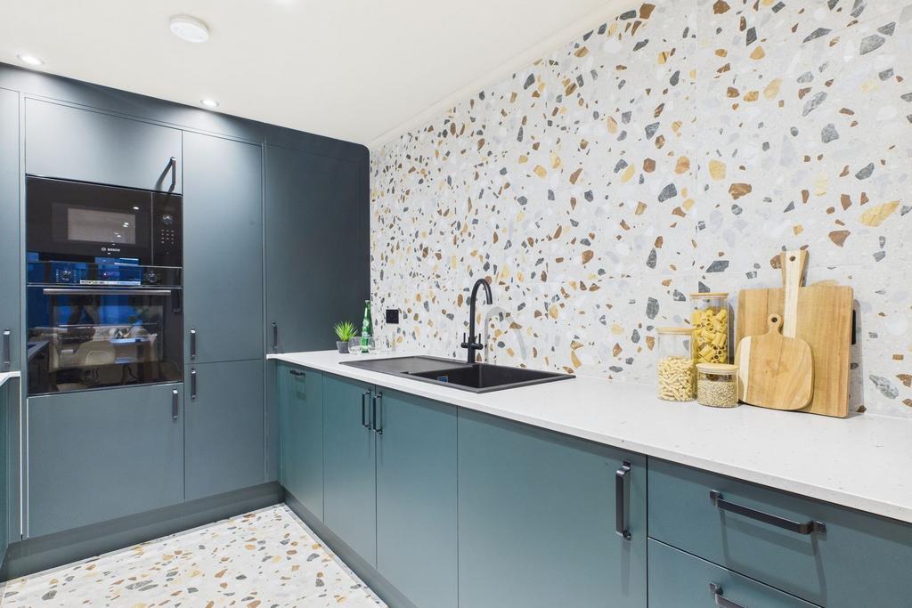 The brand-new kitchen brings a modern Shoreditch softness - concrete-colour quartz worktops, a beautiful green finish, terrazzo tiling up to the ceiling, and a full suite of high-quality appliances. It’s both a workspace and a centrepiece.