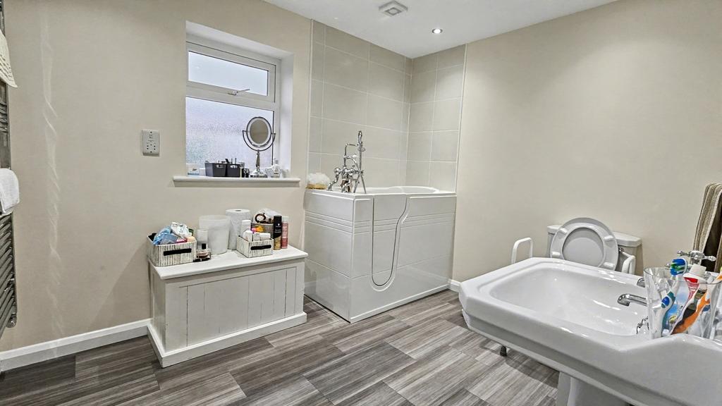 BATHROOM with laminate flooring, window, heated towel rail, extractor fan, white suite with panelled bath and shower fittings over, WC, and washbasin with splashback and mirror over. Shaver point and ceiling down lighters.
