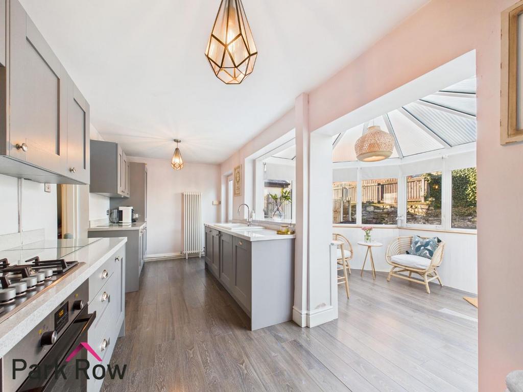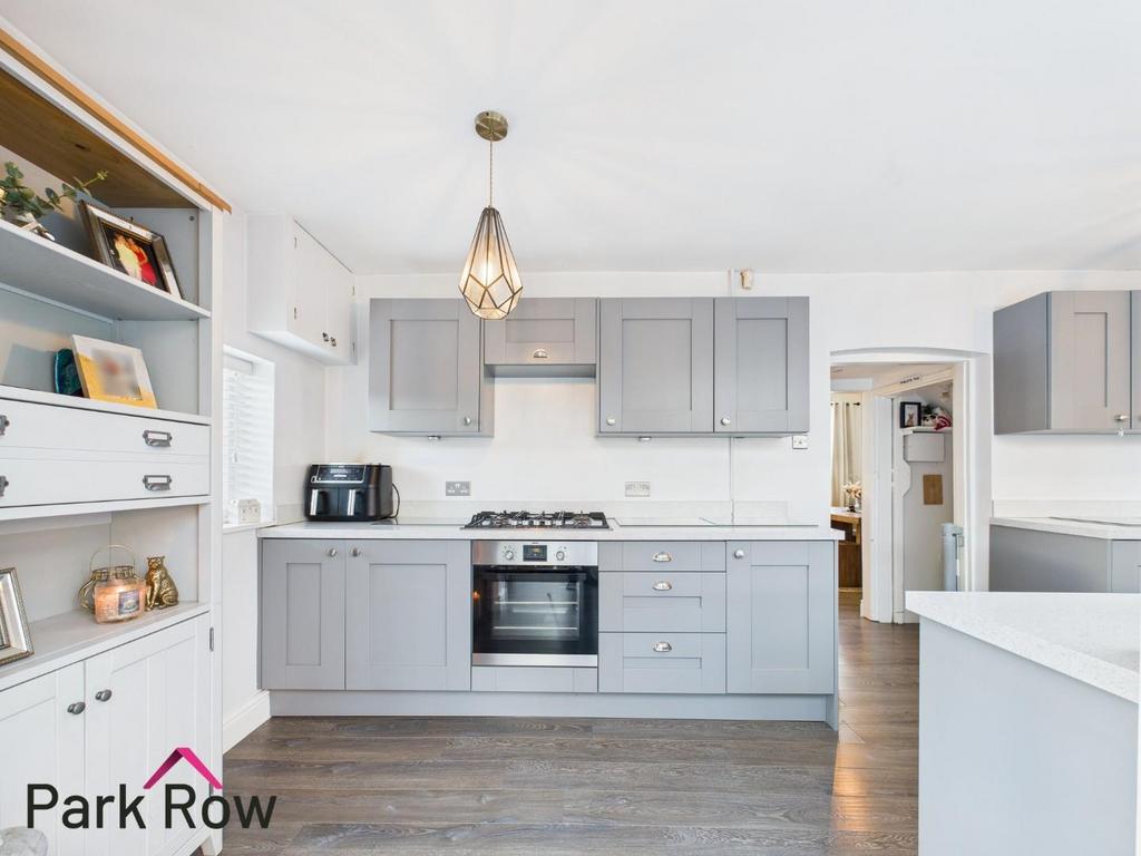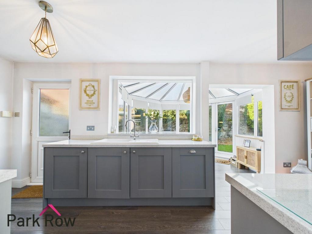 Kitchen - 5.87 x 2.30 (19'3" x 7'6") - A shaker style kitchen with grey cabinetry to wall and base units, white quartz worktop and upstands, a white ceramic drainer sink with chrome mixer taps over, a built in oven with a four ring gas hob over, integrated extractor fan, integrated fridge freezer, integral washing machine, integral dishwasher, a double glazed window to the side elevation, a white uPVC door with obscure double glazed glass panel within which leads to the rear garden, a servery window in to the sunroom and an opening which leads into;