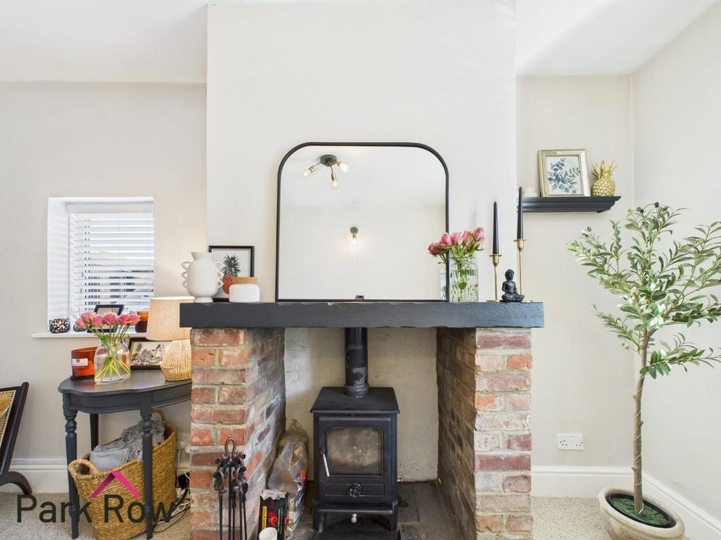 Living Room - 3.03 x 4.15 (9'11" x 13'7") - A double glazed window to the front elevation and the side elevation, a central heating radiator and a log burner set within a brick surround with a black wooden mantel.