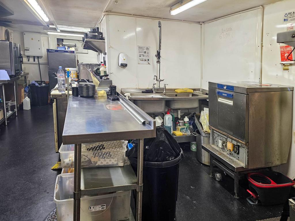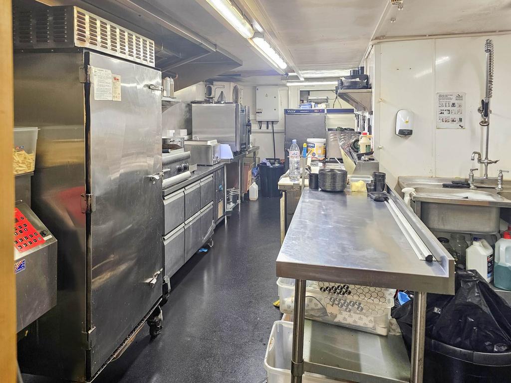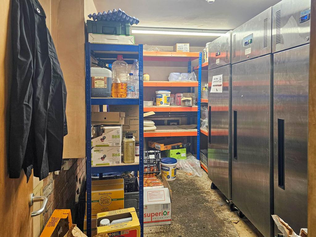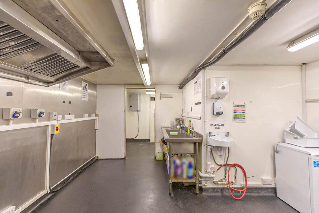 Lighting, commercial extractors, twin sink unit, hand wash basin, space for appliances and cookers. Opening to further storage with spaces for friddge and freezers.