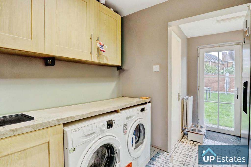 The ground floor features a spacious living room with a dedicated dining area, flowing into a well-designed kitchen with ample storage. You also benefit from a downstairs WC, a useful utility area, and a versatile multi-purpose room currently used as a home office — ideal for home working or conversion to a playroom or snug.