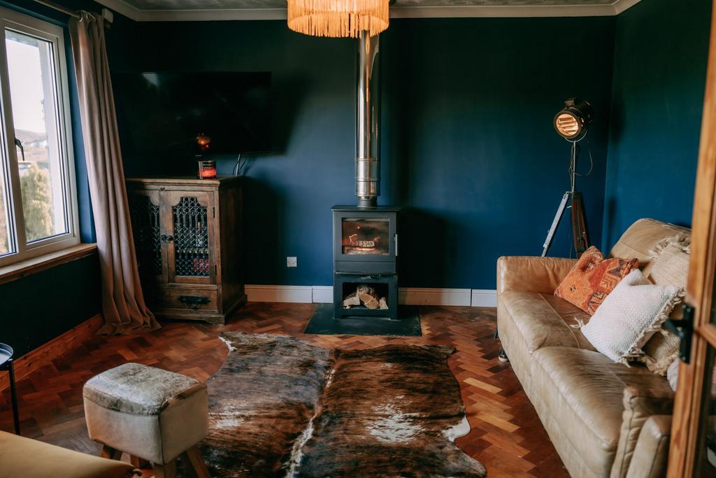 Windows to front elevation, free standing multi-fuel stove set on a slate hearth, Iroko hardwood parquet flooring.
