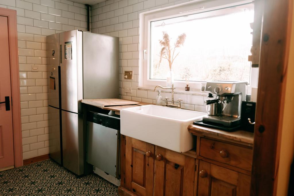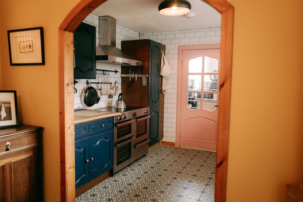 Half glazed door, windows to rear elevation with mountain views, range of wooden wall and base units with natural wooden worktops, Belfast sink, dual fuel 5 ring Belling Range cooker with two ovens and grill, stainless steel extractor over, space for American style fridge freezer, space and plumbing for dishwasher, fully tiled, patterned tiled ceramic floor, arched access to dining room:
