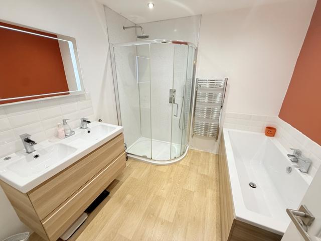 Upstairs, there are five double bedrooms. The master bedroom features a dressing area and a rear-facing double-glazed window. One additional bedroom overlooks the mature rear garden, while the remaining three are located at the front of the property. The family bathroom is fitted with a large corner shower with hygienic decorative cladding, a spacious bath, vinyl flooring, a stylish double wash handbasin, WC, and radiator.