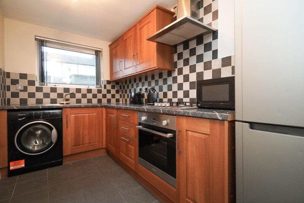 The well‑presented communal hall benefits from a controlled entry system. The flat comprises a central hallway with a built-in storage cupboard. To the front, a large, bright lounge features a front window and space for a family dining area. The fitted kitchen includes an integrated oven, hob and extractor hood and overlooks the communal grounds at the rear. There are two generous double bedrooms; Bedroom 1 has a door leading to a small front balcony and Bedroom 2 is a well‑proportioned rear room with deep built‑in wardrobes. The stylish shower room is fully tiled and fitted with a multi‑jet tower shower.