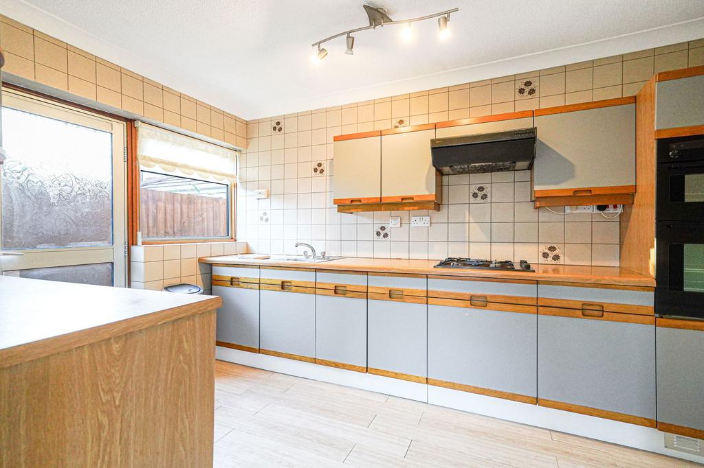 Being fitted with a range of wall, drawer and base units with complementary work surfaces over, sink and drainer unit with mixer tap, four ring gas hob with extractor canopy over and inset eye level double electric oven. Space for fridge and freezer, tiling to splash prone areas, radiator, ceiling light point, double glazed window and door to side and opening into
