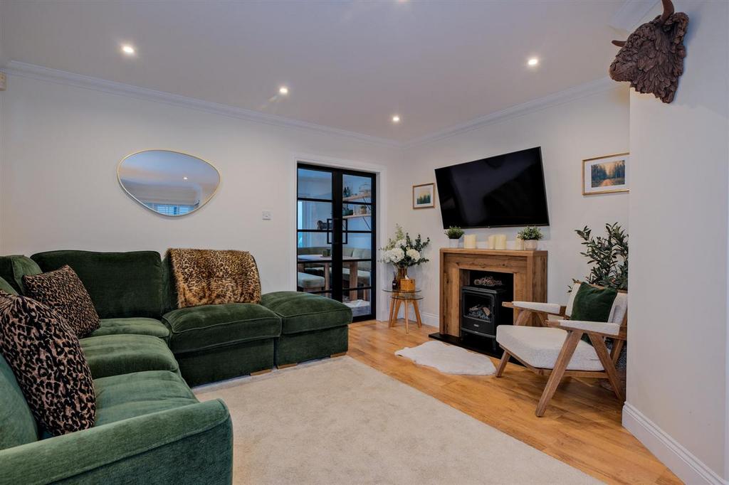 What about a gorgeous big lounge, tastefully decorated with neutral tonal decor, wood laminate flooring, bay window, modern oak wood feature fireplace, and sleek black framed glass double doors leading into the kitchen?