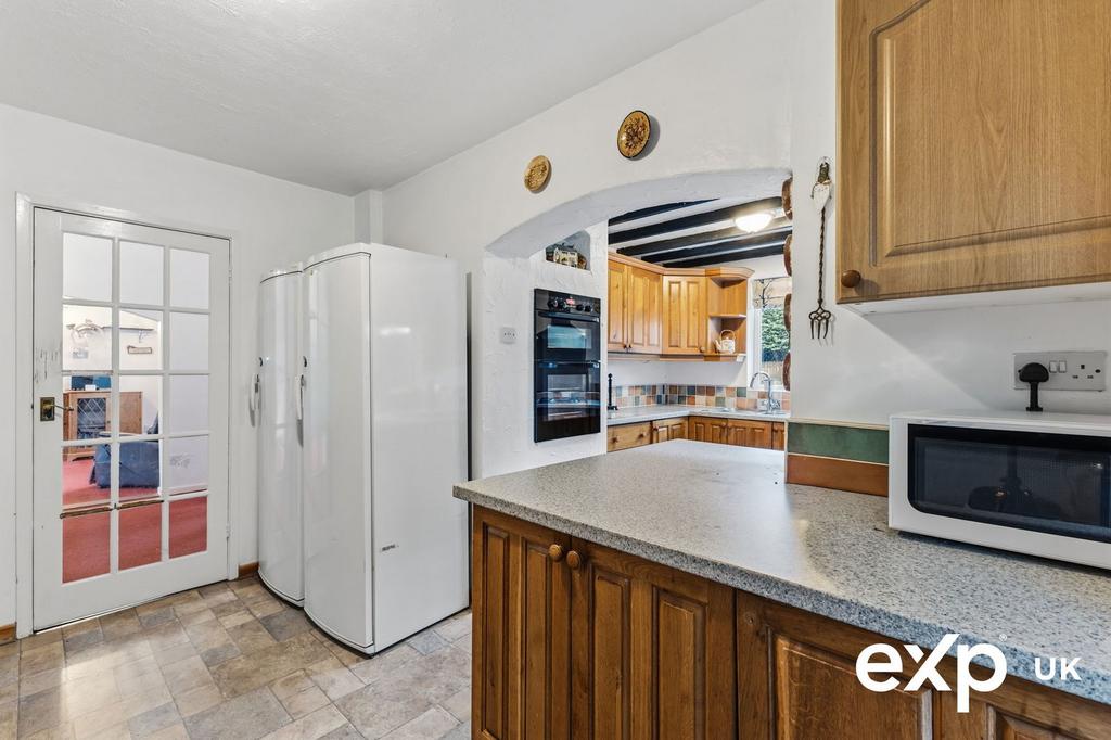 The kitchen is fitted with an arrangement of numerous wall and base units with plenty of storage. Ample worktop space with plenty of room for food preparation is inset with a one-and-a-half bowl sink and drainer. Appliances include an oven and grill, a four-ring gas hob with an extractor above and there is a dishwasher as well as plumbing for a washing machine. Two uPVC windows to the rear maximise the light and airy space. Decorative beams to the ceiling add a touch of character, and tiled splashbacks finish the décor.