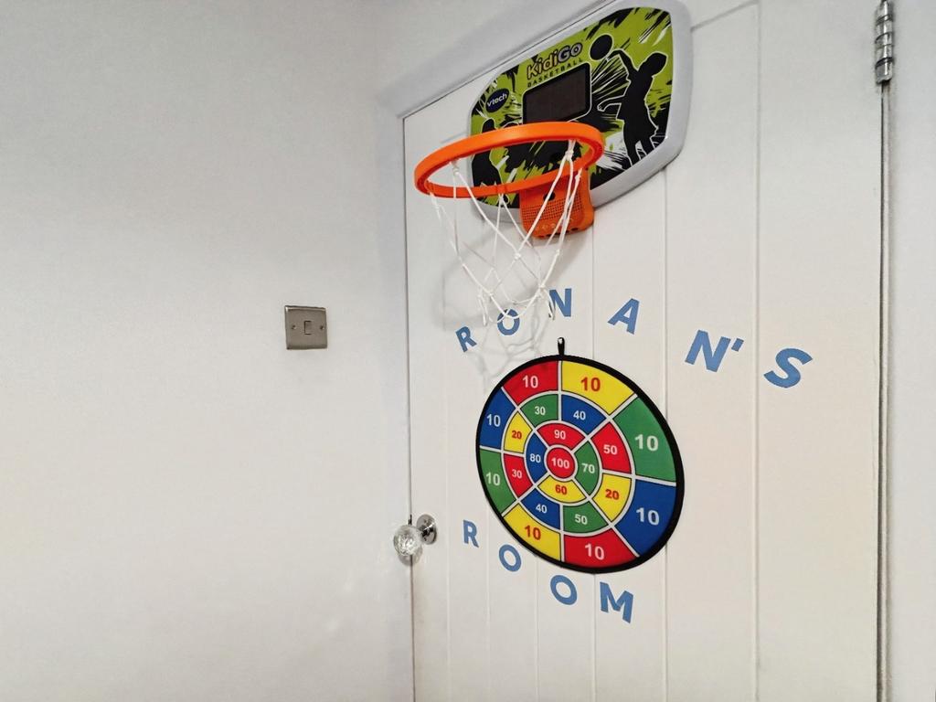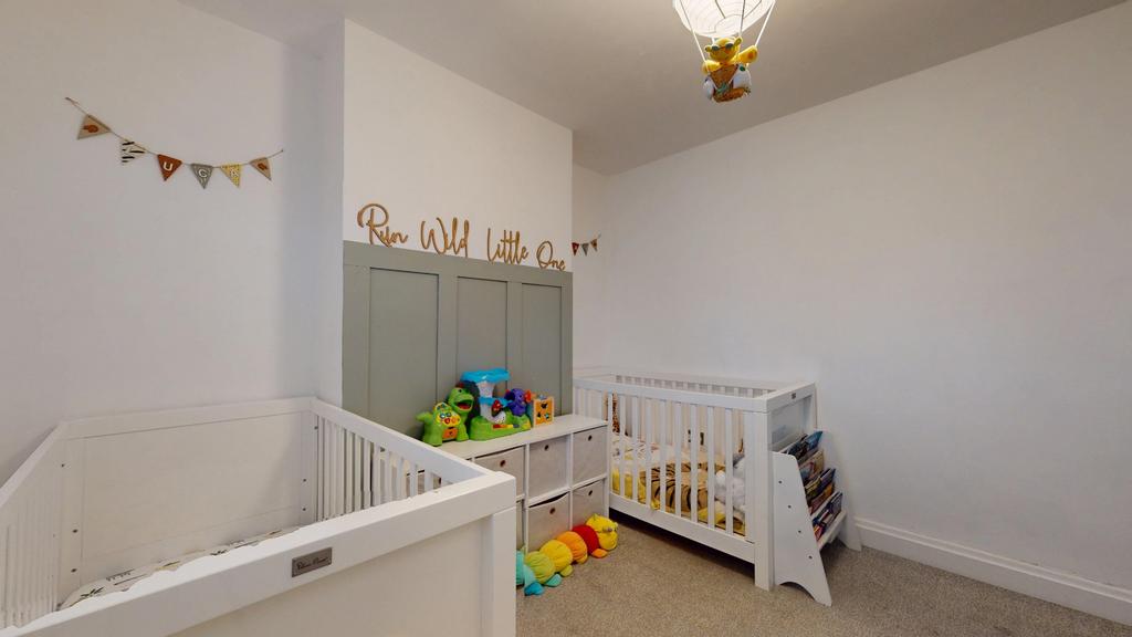 Second Bedroom: A generously sized double room with alcoves perfect for wardrobes. It is currently used as a nursery and comfortably fits two cots and additional storage, showing its flexibility.