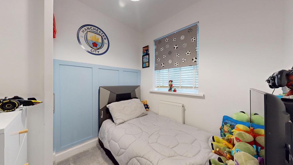 Third Bedroom: A cosy space ideal for a single bedroom or home office, currently arranged with a single bed and wardrobes.
