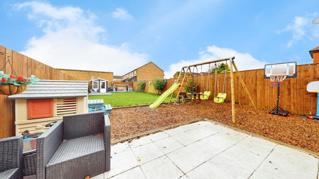 The rear garden is exceptionally large, one of the standout features of this property. North East facing, it enjoys sunlight throughout the day thanks to its impressive length. The garden is a wonderful blend of lawn, paved patio, and a dedicated chip wood play area, perfect for families with children. It offers fantastic potential for outdoor dining, play, and future landscaping ideas.
