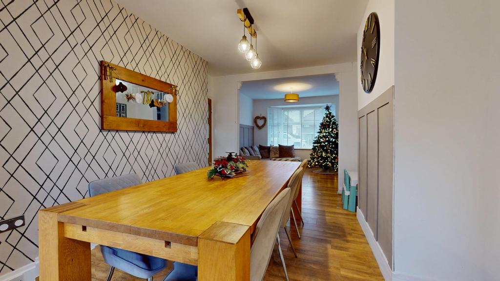 To the left, the living space is generously proportioned, offering plenty of room for a corner sofa. It features beige wall panelling, a faux log burner with a stylish surround, and a large front-facing window with fitted blinds. This beautifully presented room opens seamlessly into the dining area, which currently accommodates an eight-seater table with ease. Two windows and a door to the garden allow the space to fill with natural light, creating an airy setting ideal for family meals or entertaining guests.