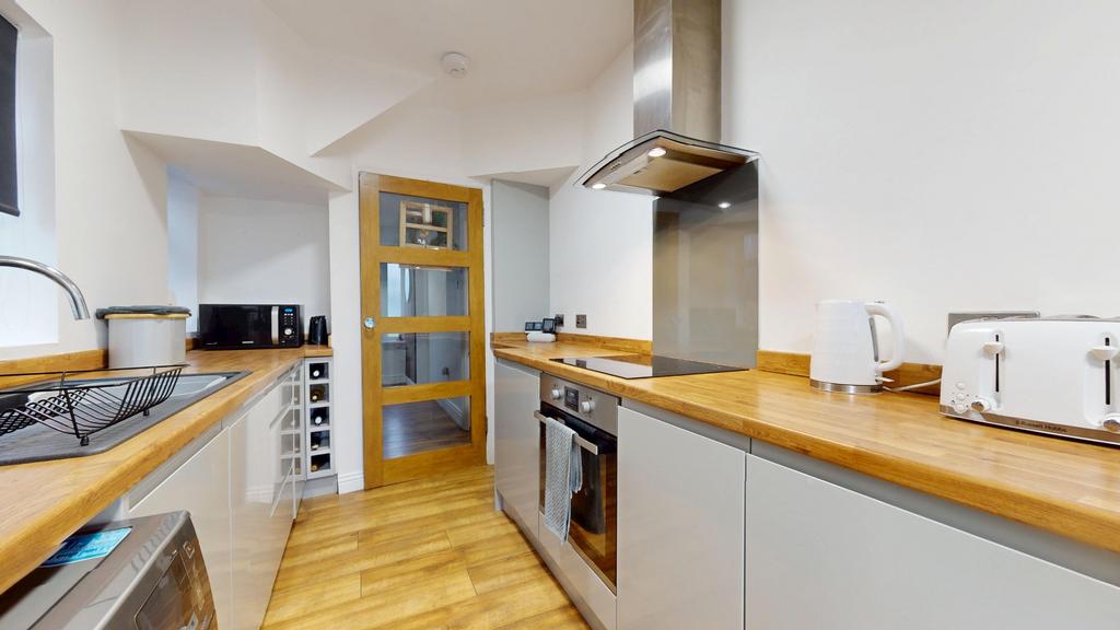The modern kitchen is fitted with sleek grey handleless units paired with a wooden worktop, offering a warm, contemporary finish. Integrated appliances include a fridge-freezer, oven, and hob. Glass-panelled doors throughout the ground floor enhance the flow of light and add a touch of elegance.