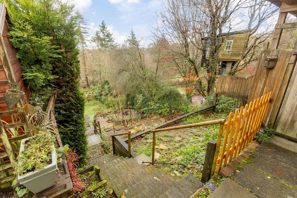 A character mid terraced home on the outskirts of the ever popular village of West Hoathly with its charming village centre comprising period cottages and houses, parish church and well known 16th Century Inn. The house stands on the ridge with pleasant northerly views to the rear over Gravetye Woods and local farmland towards East Grinstead. West Hoathly is well placed for access to a variety of local schools including its own village primary, upper schools in the area including Worth, Sackville, Cumnor House and Michael Hall. The nearest town is East Grinstead providing extensive shopping, sports/leisure amenities and rail services to London. The larger village of Forest Row with a surprising range of specialist shops, cafes restaurants, and stores. Gatwick Airport/Station and the M23 Motorway are within fifteen miles. The property has a well decorated modernised interior with the accommodation arranged over three floors. On the ground floor there is an enclosed entrance porch having a door to the living room with a brick fireplace and wood burning stove. The kitchen/dining room is also on this level with worktops, deep butlers sink and white units comprising cupboards and drawers. Stairs lead down to the lower ground floor which has the modern bathroom with white suite of panelled bath, mixer tap/shower attachment, hand basin, W.C. suite. There is a large basement area underneath the house. Door to the garden. On the top floor of the property there are two bedrooms, one with an ensuite shower room with shower, basin and w.c. suite, the other with built in wardrobe cupboards. Heating is provided the recently installed heat pump. The gardens are a delightful feature of the house being 100 feet in length. They are landscaped and terraced with a number of patio areas, and a lower level with a lawned area and borders the woodland to the rear.