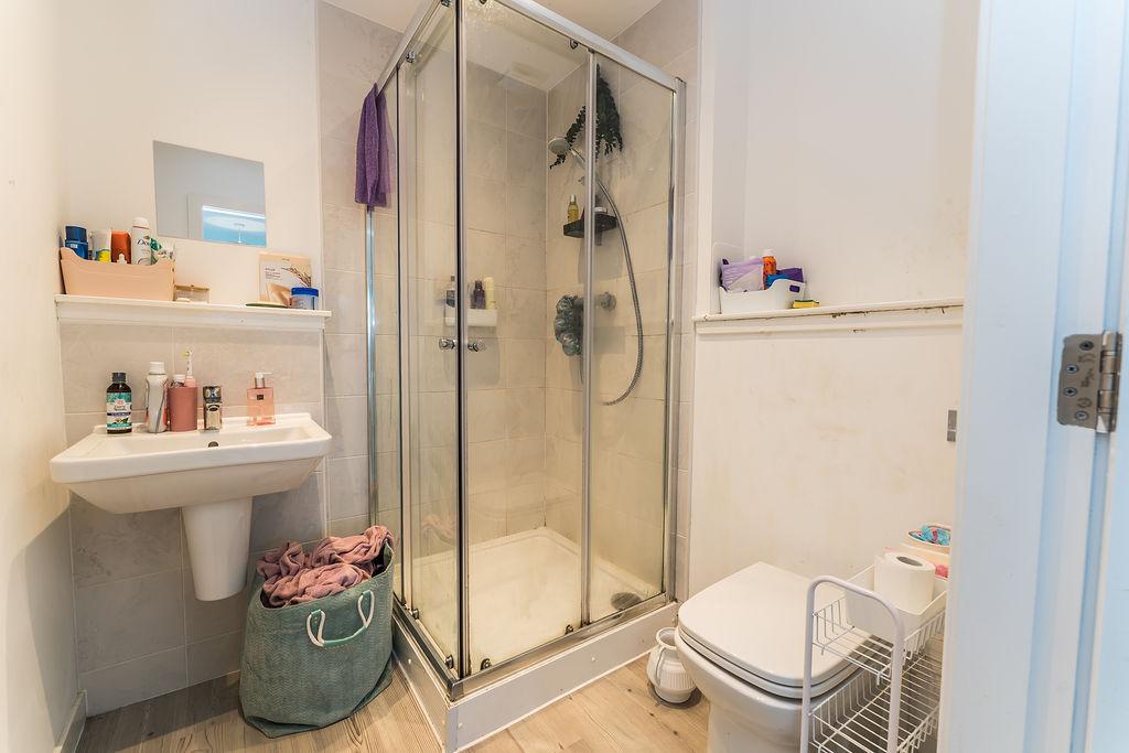 ~Ensuite: Contemporary shower suite with tiled enclosure, WC and wash-hand basin.