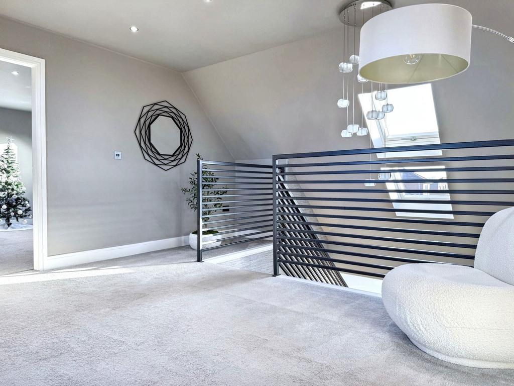 Large open plan landing with two double-glazed Velux style windows, double glazed window, modern design radiator, carpet and spotlights.