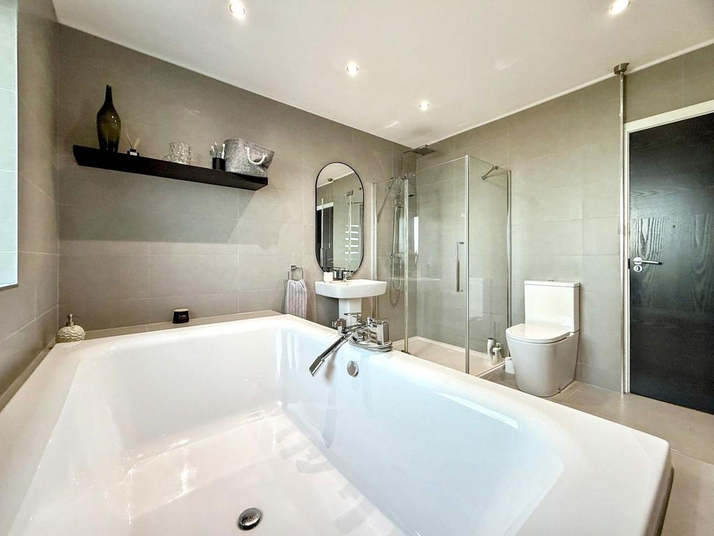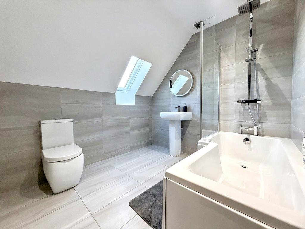 Velux window, fully tiled walls and floor, built in vanity with his and hers sinks, graphite towel warmer, desginer bath, low level W.C and spotlights.
