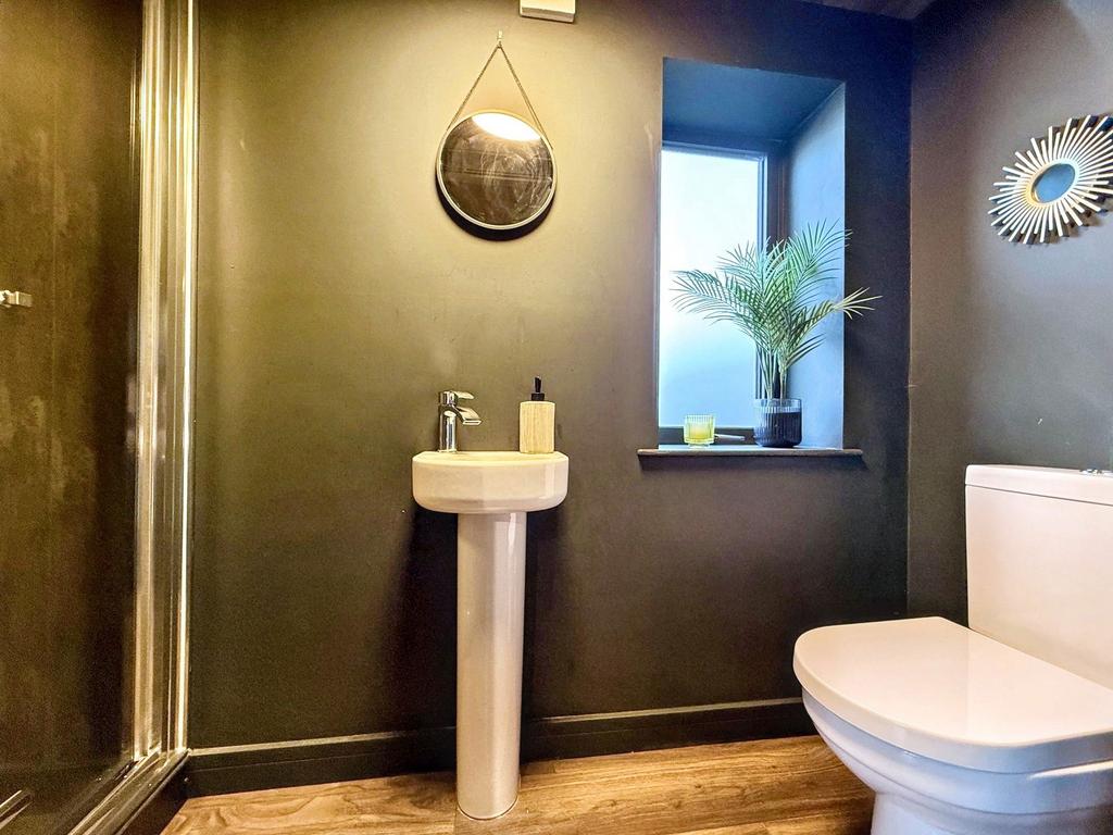Doulbe-glazed window, Drop down 2 person Bath , Shower cubicle with Bar shower, w/c, hand basin, chrome towel warmer, fully tiled walls and floor, spotlights.