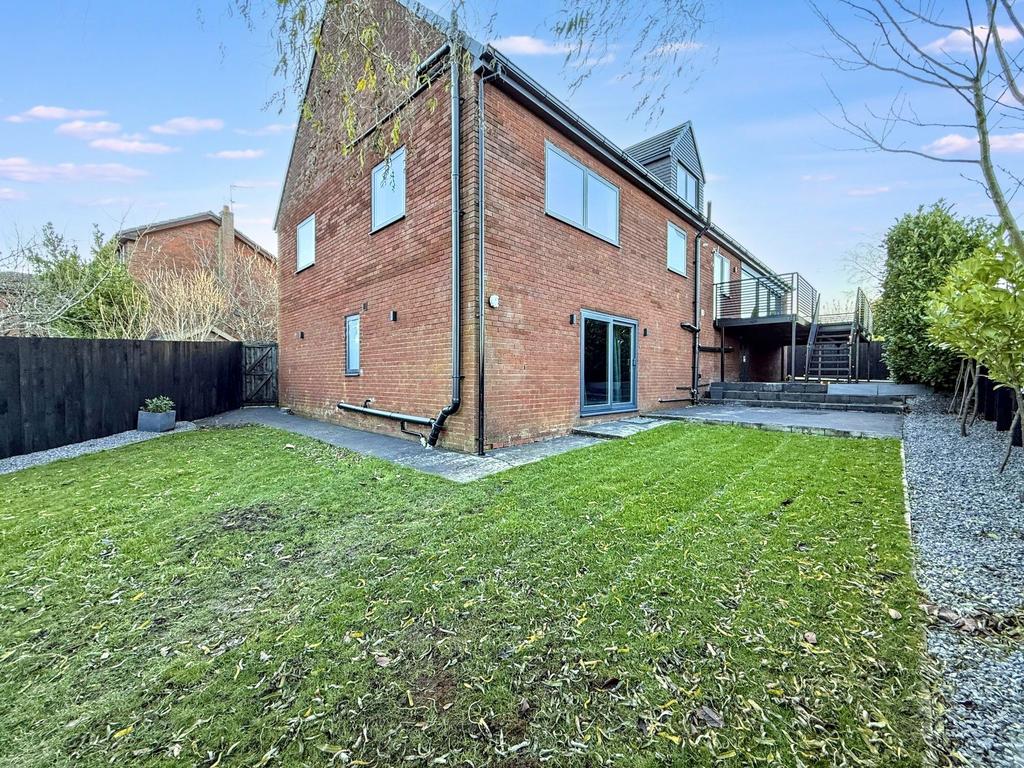 Inside, the home features a grand open-plan entrance hall with a stunning semi-floating staircase, a spacious lounge with full-height windows and bi-fold doors, an exceptional open-plan kitchen/diner, a well-equipped utility room, and a sleek ground-floor bathroom. Across its three floors, the property boasts four extremely spacious double bedrooms, with the two on the upper floor enjoying private en-suites and dressing rooms.
