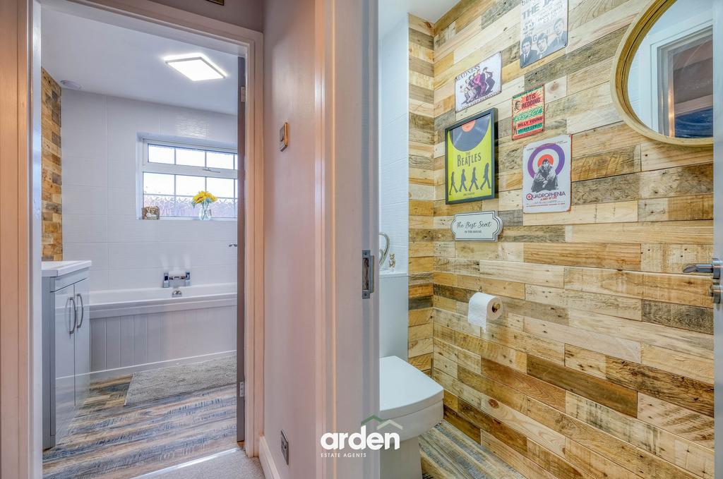 Upstairs, the landing provides useful built-in storage and gives access to all rooms. The accommodation includes a generous master bedroom, a second double bedroom, and a well-proportioned third bedroom. The modern family bathroom is fitted with both a bath and a separate corner shower enclosure, complemented by an additional separate WC.