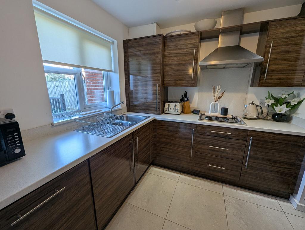 Range of wall and base gloss units with contrasting work surfaces, integrated high level oven, gas hob with extractor hood, integrate fridge/freezer, integrated washing machine, integrated dishwasher, sink with mixer tap and drainer, UPVC double glazed window, tiled splashback and tiled flooring.