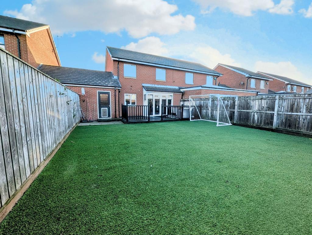 Enclosed rear garden with decked patio and artificial lawn.