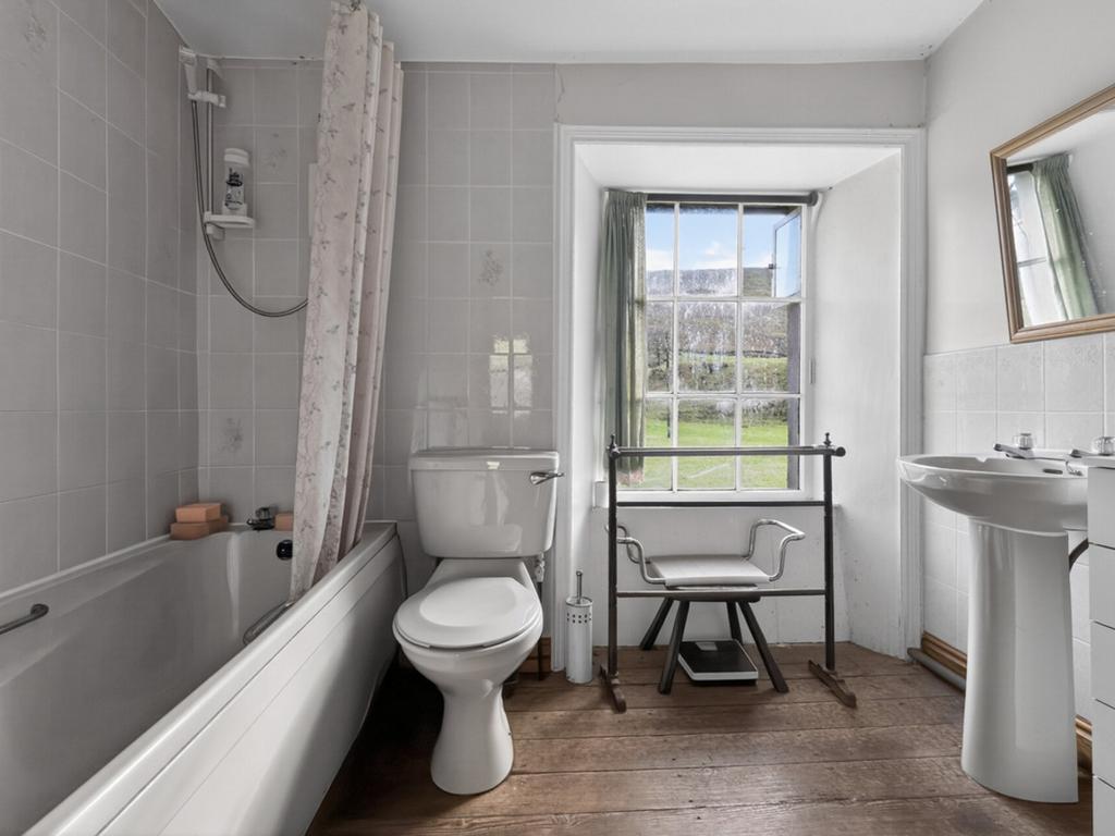 Floorboards. Part tiled walls. W/C. Wash basin. Bath with shower over. Night storage heater. Window to the rear.