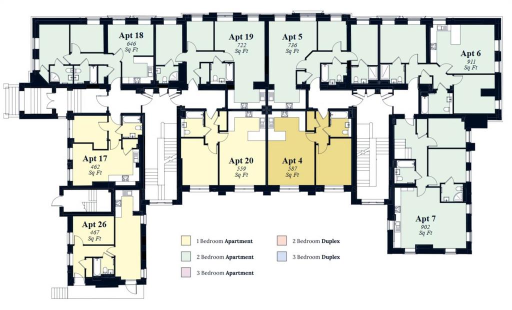 Taking shape from the historic Kings School for Girls, Apartment 4 sits on the first floor of The Old School House and is accessed via the entrance on Wilmot Road, up the original staircase. The modern open-plan living space includes a stylish kitchen with a practical breakfast bar and spotlight features, creating a contemporary feel.