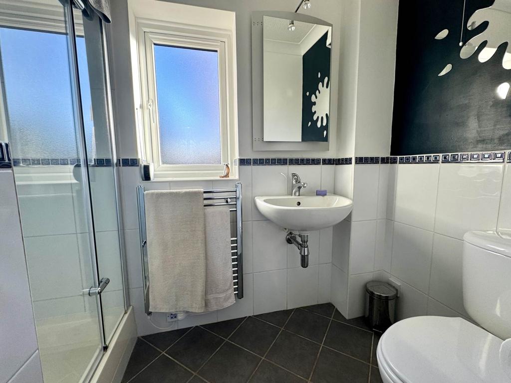Fitted with a white suite comprising walk in shower, wall mounted hand wash basin and close coupled WC, tiled floor, part tiled walls, wall mounted heated towel radiator, recessed ceiling down lights and window to the front.