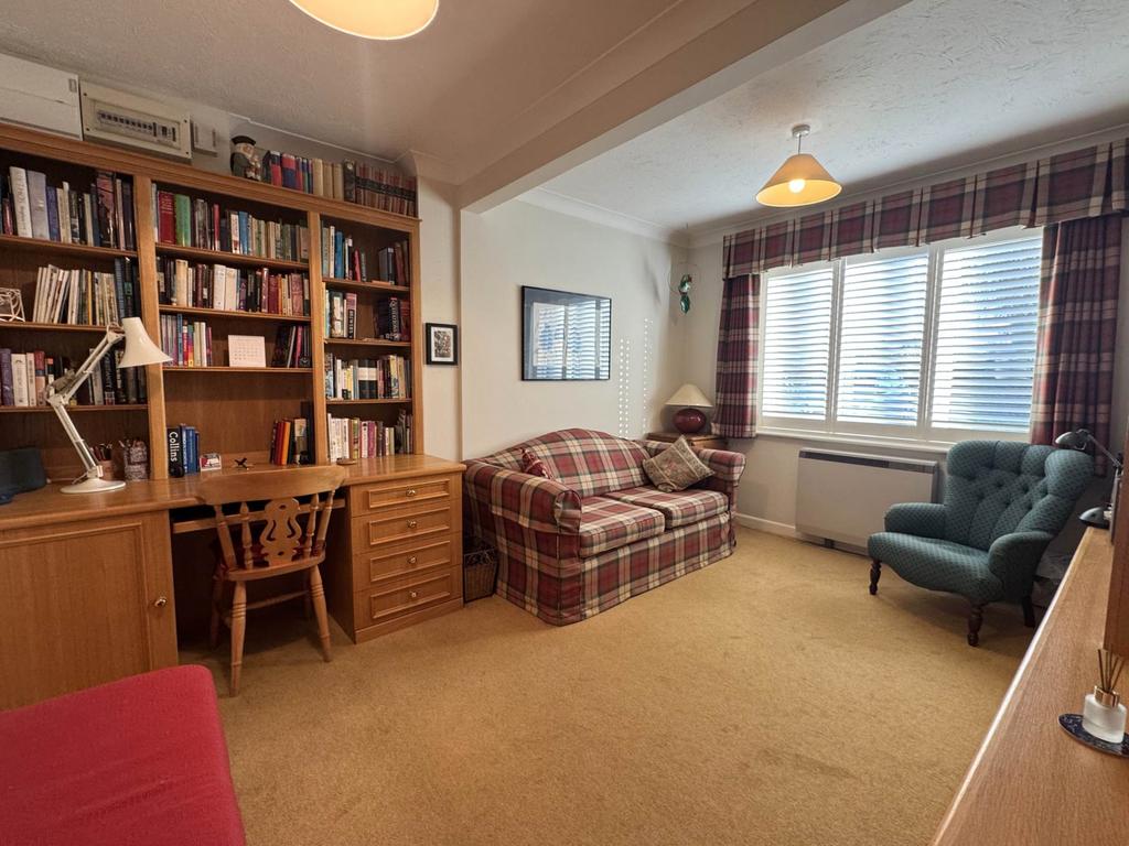 A ideal additional reception room, nicely fitted with book shelves, storage cupboards and desk space, plenty of room for seating, electric heater, ceiling light points and window to the front.