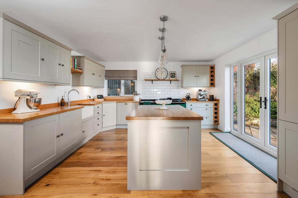 The property is entered through an entrance porch into a large, central hallway with open staircase. Double doors from the hall open into a large sitting room with log burner and Frech doors to rear. The kitchen which is garden facing is particularly impressive. Extremely spacious the kitchen which French doors to the rear garde includes a generous dining area. Newly fitted in a traditional style, Burford Grey coloured cabinets under Oak worksurfaces wrap around a central island/breakfast bar. In addition to a range of integrated appliances is a four oven mains gas fired Aga in English Racing Green.