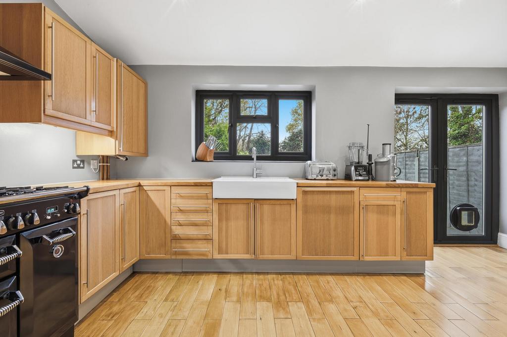 To the back of the house, the generous kitchen/diner enjoys a sunny south-easterly aspect, perfect for morning light, along with ample room for a large dining table, American-style fridge/freezer, range cooker, wide double butler style sink and an extensive run of cabinetry. The ground-floor W.C., which currently includes excellent built-in storage, a shower, and a Miele washing machine.