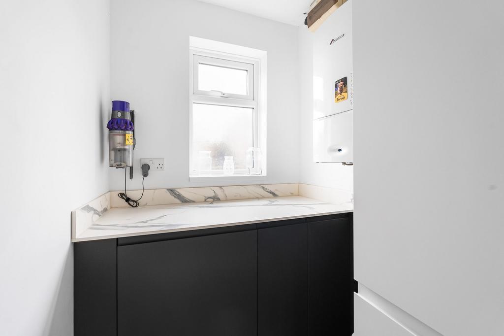 A functional utility room fitted with cupboard units, worktop space and plumbing for a washing machine with an obscure window to the front. The gas fired boiler is sited on the wall.