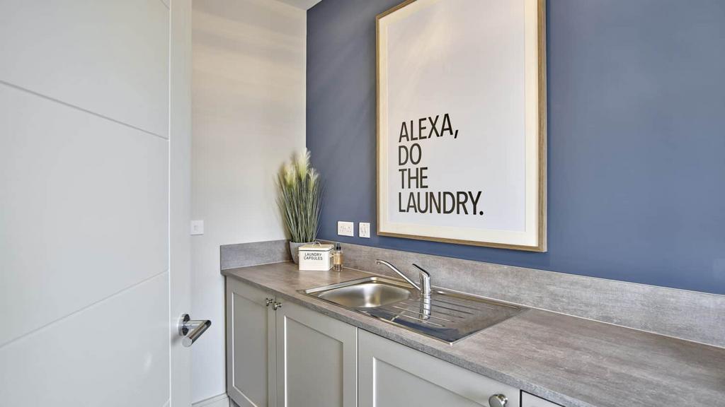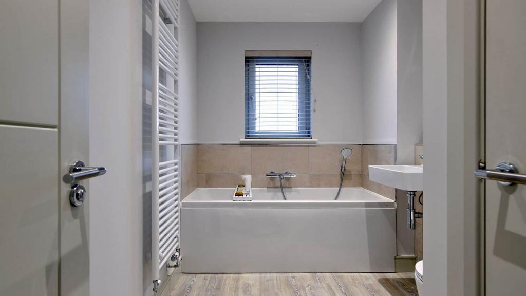 The downstairs area comprises a light and spacious open plan designer kitchen and family area, with French doors out onto the garden. This large, light, open plan space features a designer kitchen and quality integrated appliances; the perfect space to dine, work, entertain or relax. Downstairs also comprises a generous-sized lounge with large statement windows allowing for optimum light, a separate utility room with direct access from the kitchen and outside, a WC and plenty of storage space.